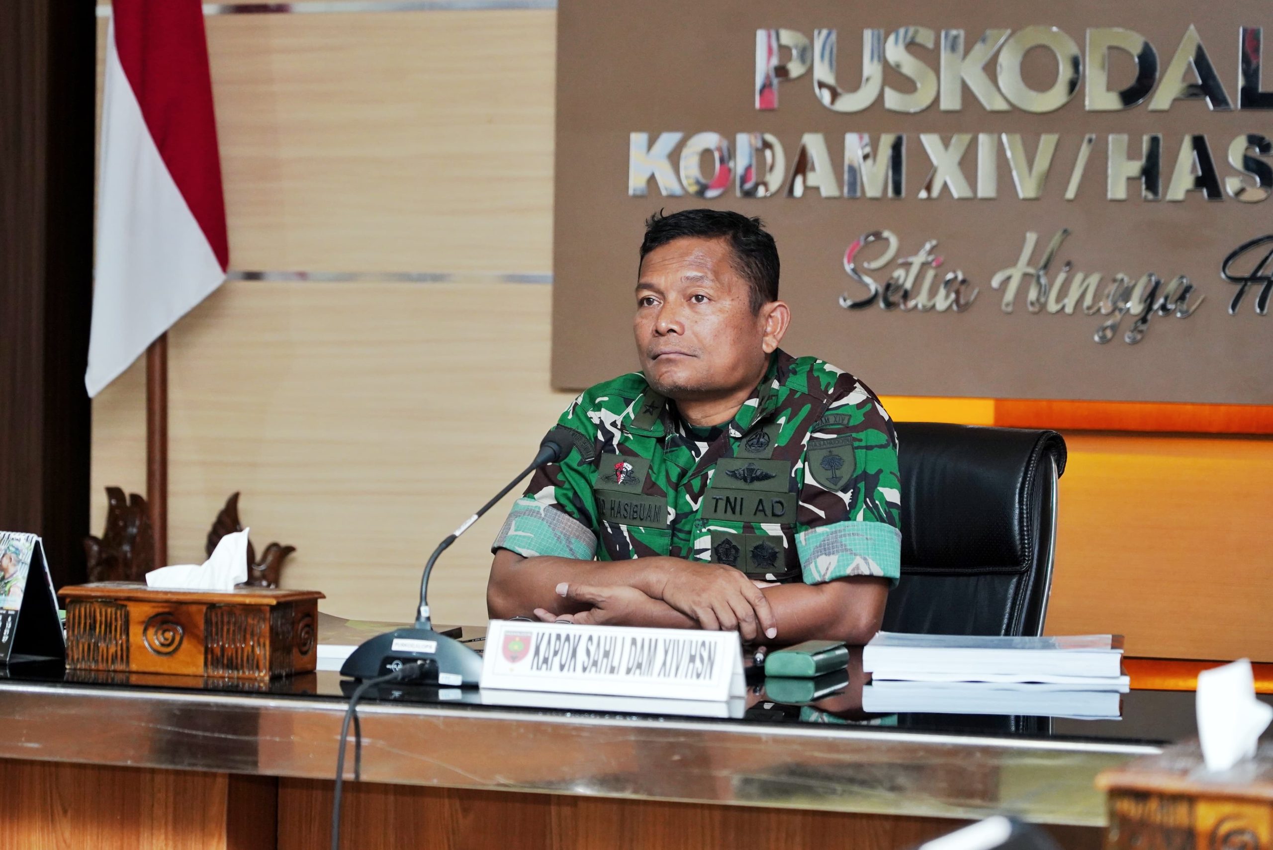 MERAHPUTIHKU.com, MAKASSAR – Kepala Kelompok Staf Ahli (Kapoksahli) Pangdam XIV/Hasanuddin Brigjen TNI Musa David Marolop Hasibuan S.I.P, M.A.B., mengikuti Rapat Koordinasi (Rakor) Nasional Sinkronisasi Tata Ruang Pertahanan yang dipimpin oleh Deputi Bidang Koordinasi Pertahanan Negara dan Kesatuan Bangsa Kemenko Polkam RI Mayjen TNI Purwito Hadi Wardhono secara Video Conference (Vicon), bertempat di Ruang Vicon Puskodalops Makodam, Jl. Urip Sumoharjo, Kota Makassar. Rabu, (12/11/2025).